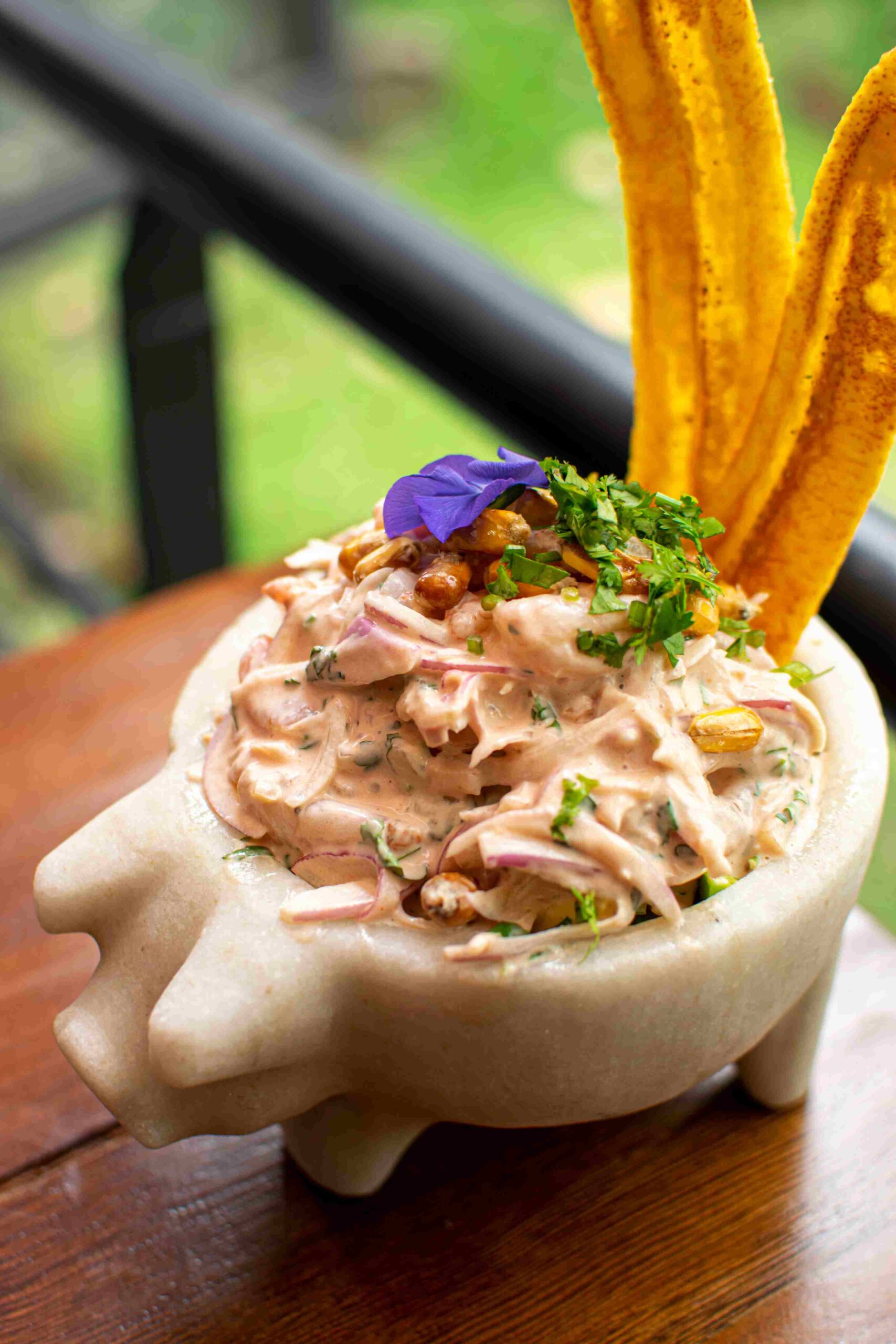 Preparado en salsa roja americana o salsa golf rosada con el toque matriarca (Ron y pasta de ajo) en cítricos, mostaza, cebolla acevichada y cilantro.